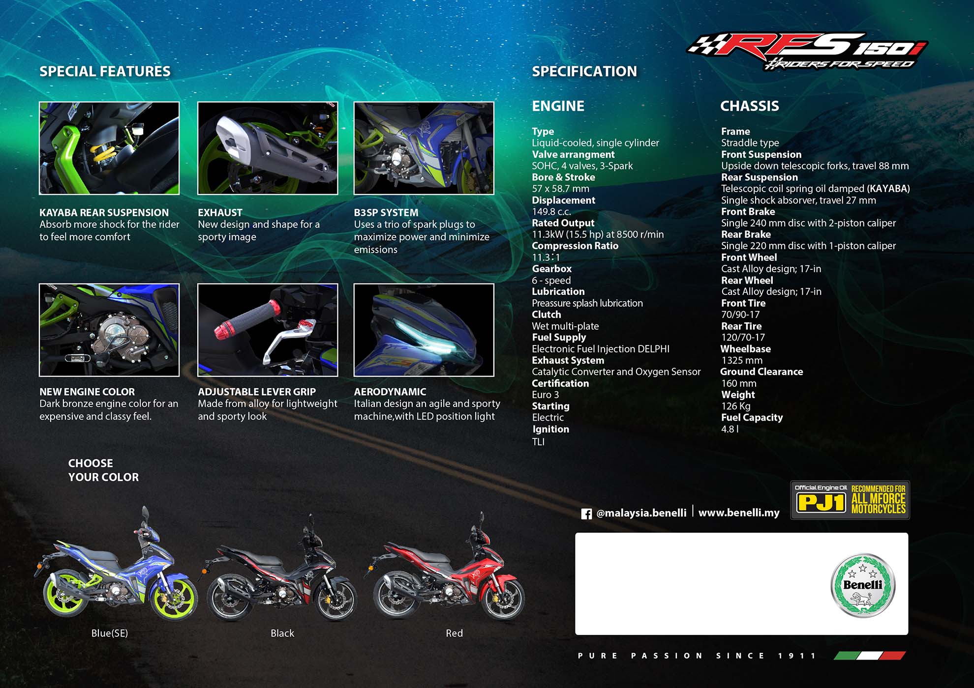 Harga jualan bagi Benelli RFS150i grafik baharu ini adalah RM 7,238.00 bagi versi standard dan RM7488.00 bagi versi SE. Semua harga yang disebut adalah tidak termasuk cukai jalan dan insurans. Sila kunjungi ruang pameran Benelli yang sah berhampiran anda untuk maklumat lanjut.