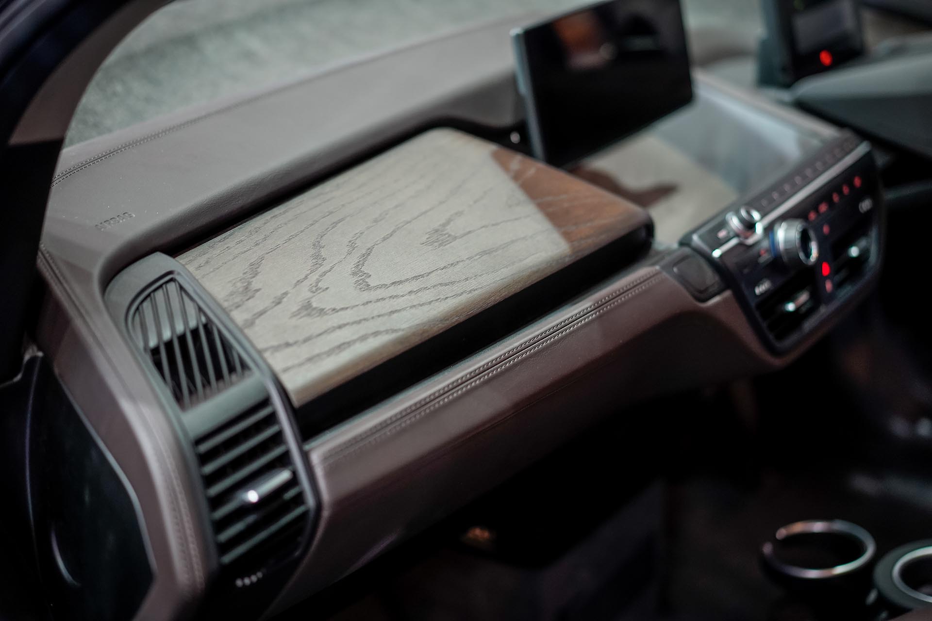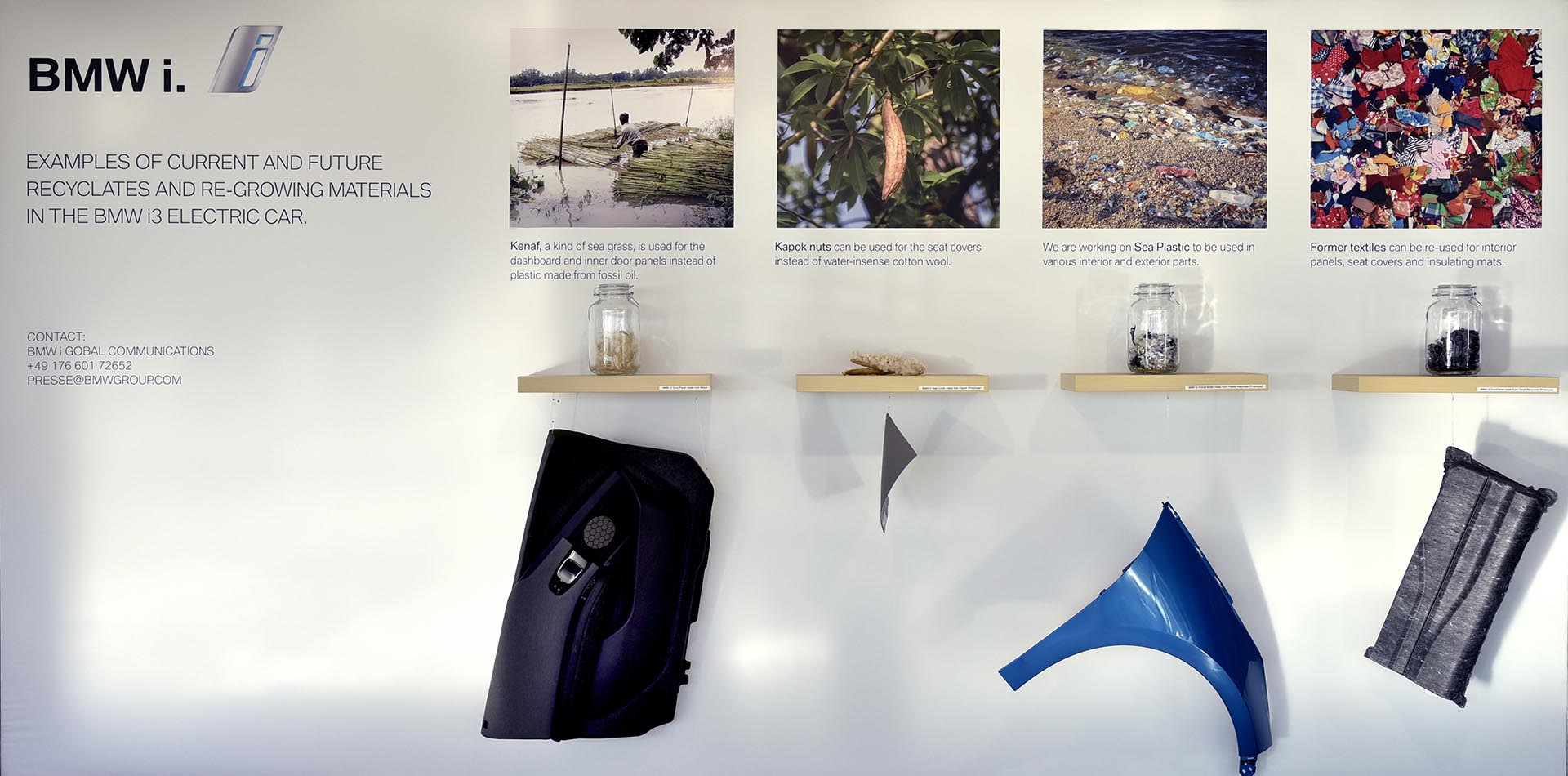 Permukaan interior diperbuat daripada 80% bahan boleh dikitar semula, bahan natural, termasuk bahan yang telah dikitar semula. Mengimbas ke seksyen hadapan, panel instrumen yang menawan dapat dilihat oleh pengguna, ia diperbuat daripada kayu eucalyptus berliang terbuka yang dituai dengan kaedah yang tertib. Permukaannya yang berciri kalis lembapan bermakna ia memerlukan tahap pemprosesan permukaan yang jauh lebih rendah, iaitu sebanyak 90% berbanding material kayu konvensional. Pada tahun 2013, BMW Group muncul sebagai pengeluar automotif yang pertama mengguna pakai kayu eucalyptus yang didapatkan daripada 100% kayu yang diiktiraf dari pengurusan perhutanan yang bertanggungjawab.