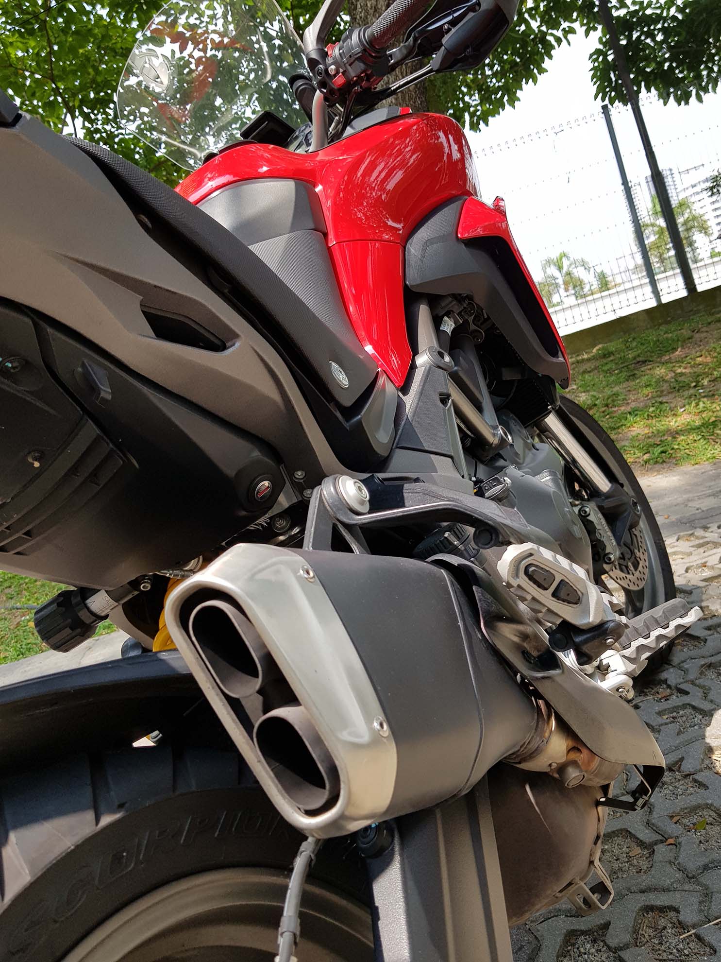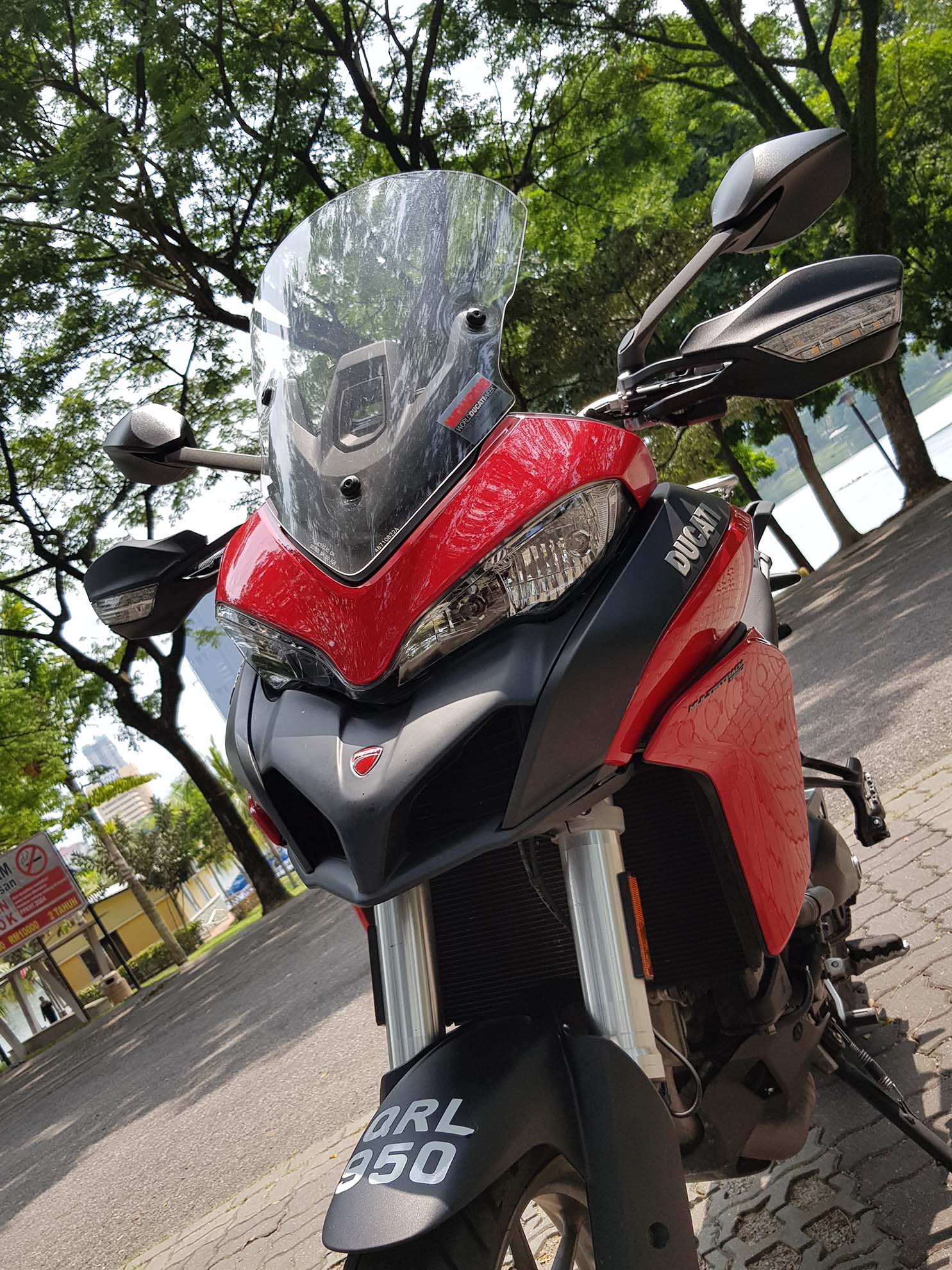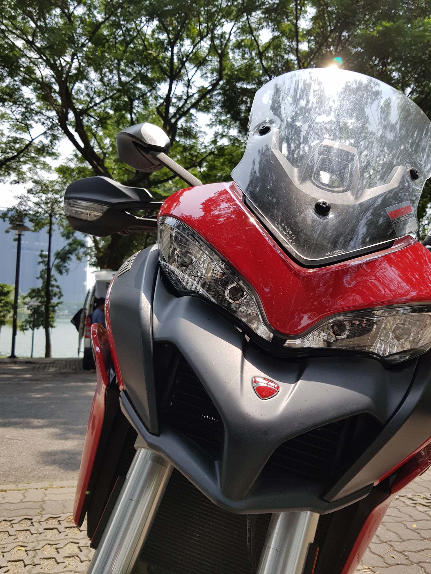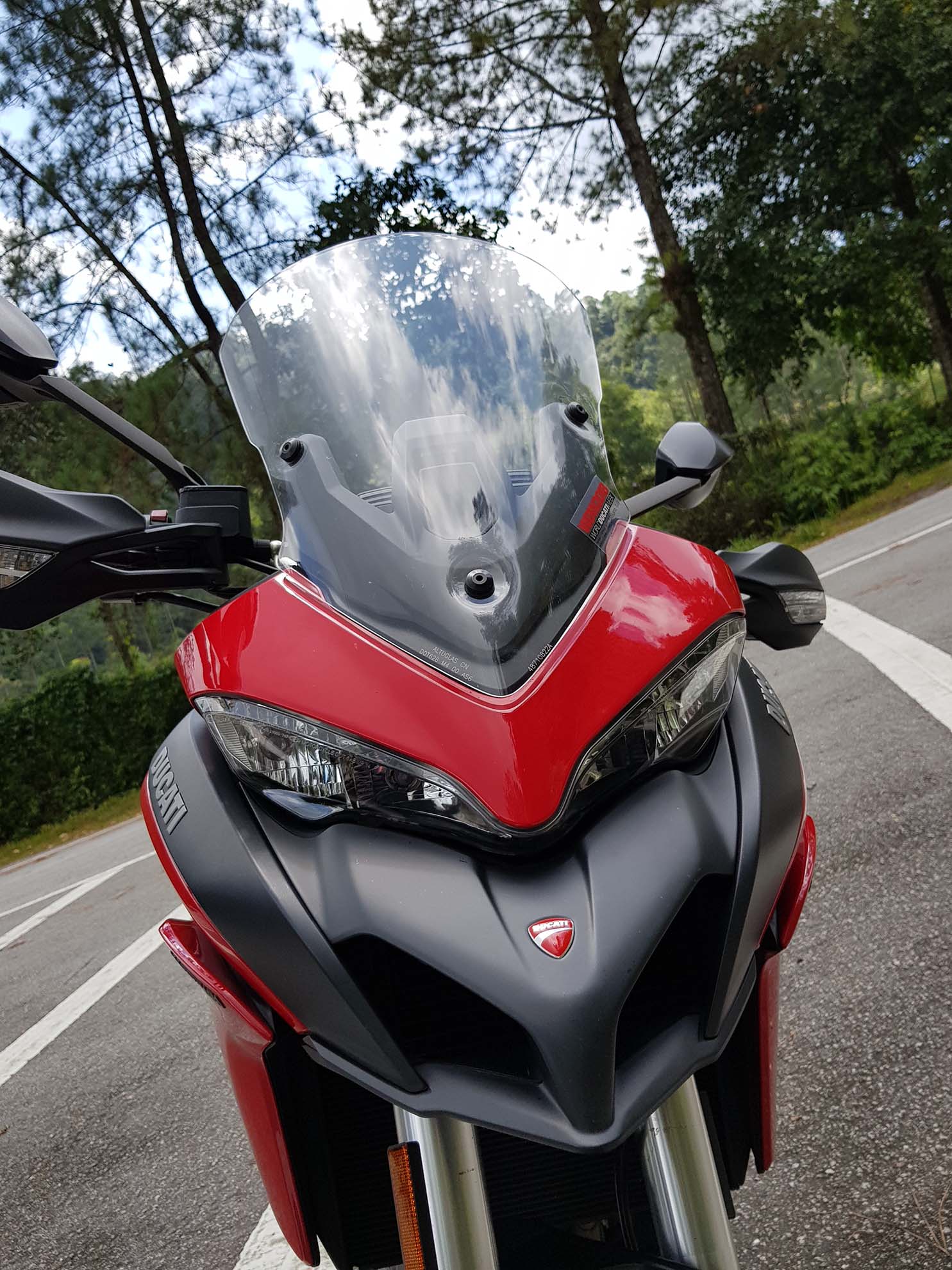 Selepas meredah kesesakan lalu lintas dengan aksi “cilok-mencilok”, tetapi dengan penuh berhati-hati, admin sampai ke rumah untuk mempersiapkan diri bagi perjalanan untuk “gathering” yang jauh sikit. Tak sah kalau tak cari tempat makan kerana biasanya destinasi sebegini mesti ada ramai rakan bikers. Kebetulan rakan bikers dari Singapura pun dah merancang untuk perjumpaan sebegini, jadi lebuh raya menjadi tempat ujian seterusnya. Walaupun perjalanan agak jauh, bila menunggang Ducati Multistrada 950 ini, admin rasa kurang cepat rasa penat atau lenguh-lenguh badan. Seperti yang admin maklumkan di awal artikel ini, kedudukan menunggang Ducati Multistrada 950 ini secara tidak langsung membantu mengurangkan tekanan kepada penunggangnya bagi perjalanan jarak jauh. Tetapi apa yang admin suka dengan Ducati Multistrada 950 ialah respon enjinnya. Enjin Testastretta Ducati dengan konfigurasi L-Twin, 4 injap setiap silinder, menghasilkan 113hp (83kw) yang amat mengasyikkan. Deruman yang dihasilkan membuatkan admin gemar untuk memecut setiap kali selepas memperlahankan kelajuan Ducati Multistrada 950 ini. Senyum je bila memecut meninggalkan kenderaan lain. Oh ye, sesekali admin akan menukar “riding mode” mengikut kesesuaian keadaan. Ducati Multistrada 950 ini mempunyai 4 “riding mode” – “touring”, “sports”, “urban” dan “enduro”. Ketika di lebuh raya dalam kelajuan tinggi, penunggang motosikal boleh cepat merasa letih kerana badan menahan angin yang kuat. Perkara ini dapat dikurangkan bila menunggang Ducati Multistrada 950 kerana penghadang angin (visor) hadapannya boleh dilaras secara manual dengan sebelah tangan sahaja bagi memberikan ciri aerodinamik yang terbaik. Mudah. Terlalu seronok menunggangnya, sedar-sedar je dah sampai di tempat berkumpul untuk makan tengah hari bersama rakan bikers dari Singapura. Masa sampai tu, rakan-rakan admin dari sana macam tak sabar menerkam untuk melihat si kuda merah model baharu ni dari dekat. Seksi bang Ducati ni. Ok, apa-apa pun isi perut dulu, lepas tu boleh sembang pasal motor. Nampak ketara perbezaan selepas kita duduk di atas motor lain dan kemudian kita duduk semula di atas Ducati Multistrada 950 ini. Satu perkataan sahaja yang boleh diungkap. SLIM. Rasa macam bawa motor kecil sahaja kata mereka. Selesai dah satu perkara dengan meracuni mereka. Kalau ada komisen jualan antarabangsa ni mesti admin boleh jadi kaya segera.