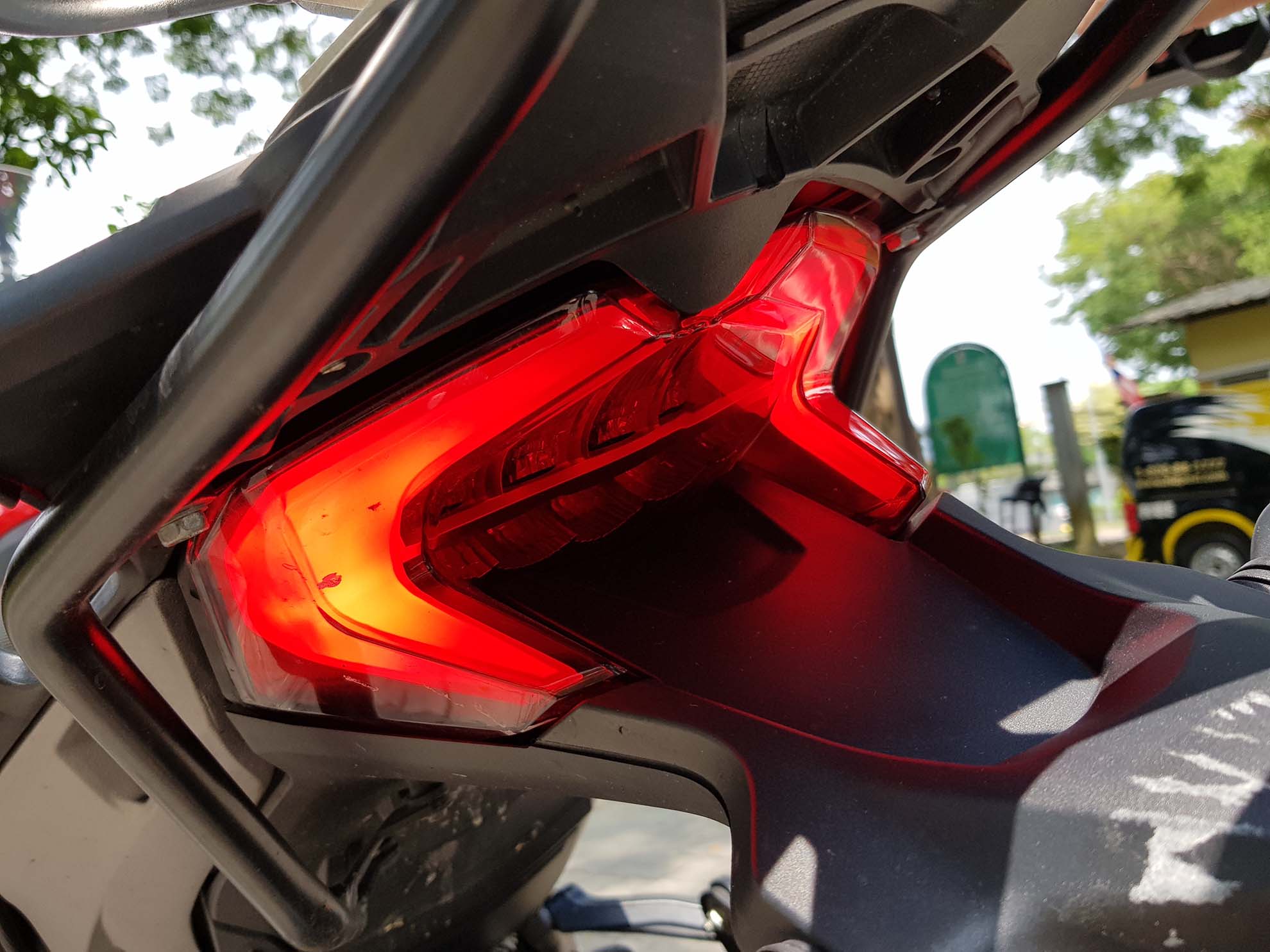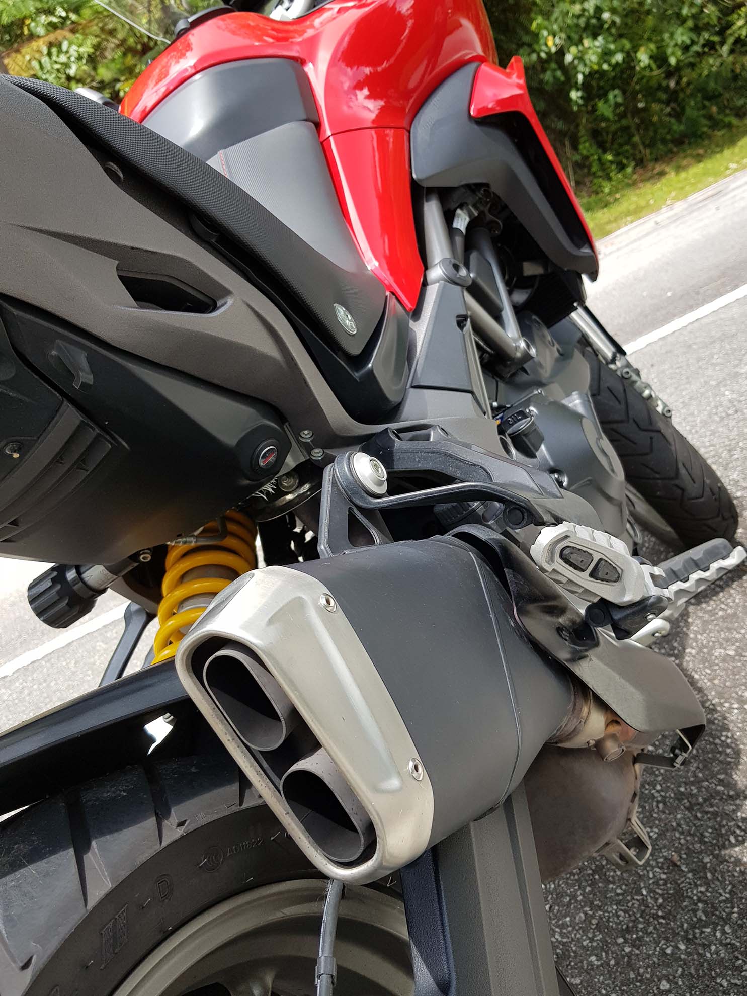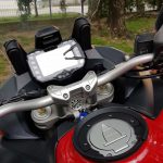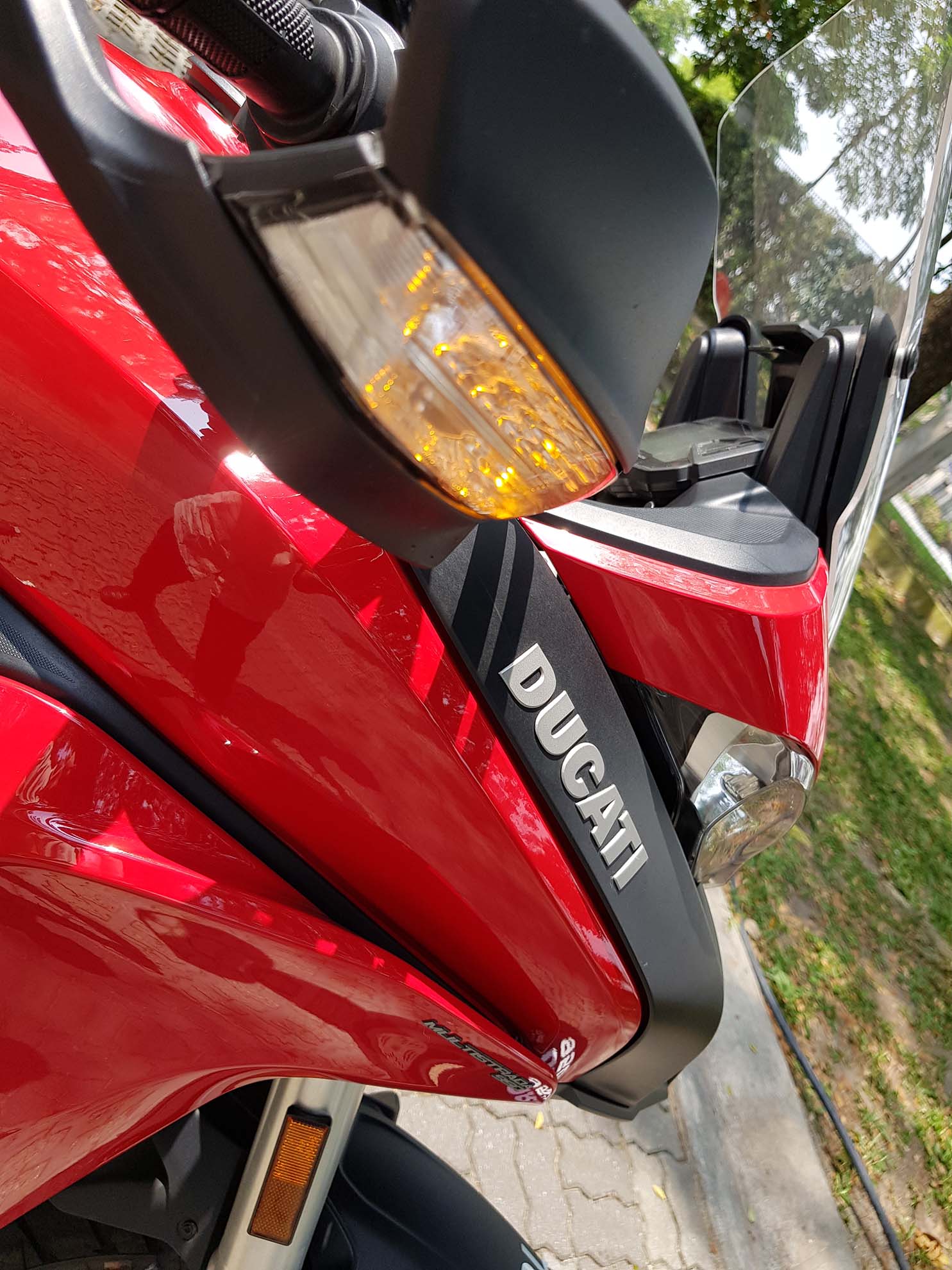 Selepas meredah kesesakan lalu lintas dengan aksi “cilok-mencilok”, tetapi dengan penuh berhati-hati, admin sampai ke rumah untuk mempersiapkan diri bagi perjalanan untuk “gathering” yang jauh sikit. Tak sah kalau tak cari tempat makan kerana biasanya destinasi sebegini mesti ada ramai rakan bikers. Kebetulan rakan bikers dari Singapura pun dah merancang untuk perjumpaan sebegini, jadi lebuh raya menjadi tempat ujian seterusnya. Walaupun perjalanan agak jauh, bila menunggang Ducati Multistrada 950 ini, admin rasa kurang cepat rasa penat atau lenguh-lenguh badan. Seperti yang admin maklumkan di awal artikel ini, kedudukan menunggang Ducati Multistrada 950 ini secara tidak langsung membantu mengurangkan tekanan kepada penunggangnya bagi perjalanan jarak jauh. Tetapi apa yang admin suka dengan Ducati Multistrada 950 ialah respon enjinnya. Enjin Testastretta Ducati dengan konfigurasi L-Twin, 4 injap setiap silinder, menghasilkan 113hp (83kw) yang amat mengasyikkan. Deruman yang dihasilkan membuatkan admin gemar untuk memecut setiap kali selepas memperlahankan kelajuan Ducati Multistrada 950 ini. Senyum je bila memecut meninggalkan kenderaan lain. Oh ye, sesekali admin akan menukar “riding mode” mengikut kesesuaian keadaan. Ducati Multistrada 950 ini mempunyai 4 “riding mode” – “touring”, “sports”, “urban” dan “enduro”. Ketika di lebuh raya dalam kelajuan tinggi, penunggang motosikal boleh cepat merasa letih kerana badan menahan angin yang kuat. Perkara ini dapat dikurangkan bila menunggang Ducati Multistrada 950 kerana penghadang angin (visor) hadapannya boleh dilaras secara manual dengan sebelah tangan sahaja bagi memberikan ciri aerodinamik yang terbaik. Mudah. Terlalu seronok menunggangnya, sedar-sedar je dah sampai di tempat berkumpul untuk makan tengah hari bersama rakan bikers dari Singapura. Masa sampai tu, rakan-rakan admin dari sana macam tak sabar menerkam untuk melihat si kuda merah model baharu ni dari dekat. Seksi bang Ducati ni. Ok, apa-apa pun isi perut dulu, lepas tu boleh sembang pasal motor. Nampak ketara perbezaan selepas kita duduk di atas motor lain dan kemudian kita duduk semula di atas Ducati Multistrada 950 ini. Satu perkataan sahaja yang boleh diungkap. SLIM. Rasa macam bawa motor kecil sahaja kata mereka. Selesai dah satu perkara dengan meracuni mereka. Kalau ada komisen jualan antarabangsa ni mesti admin boleh jadi kaya segera.