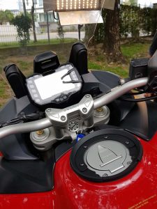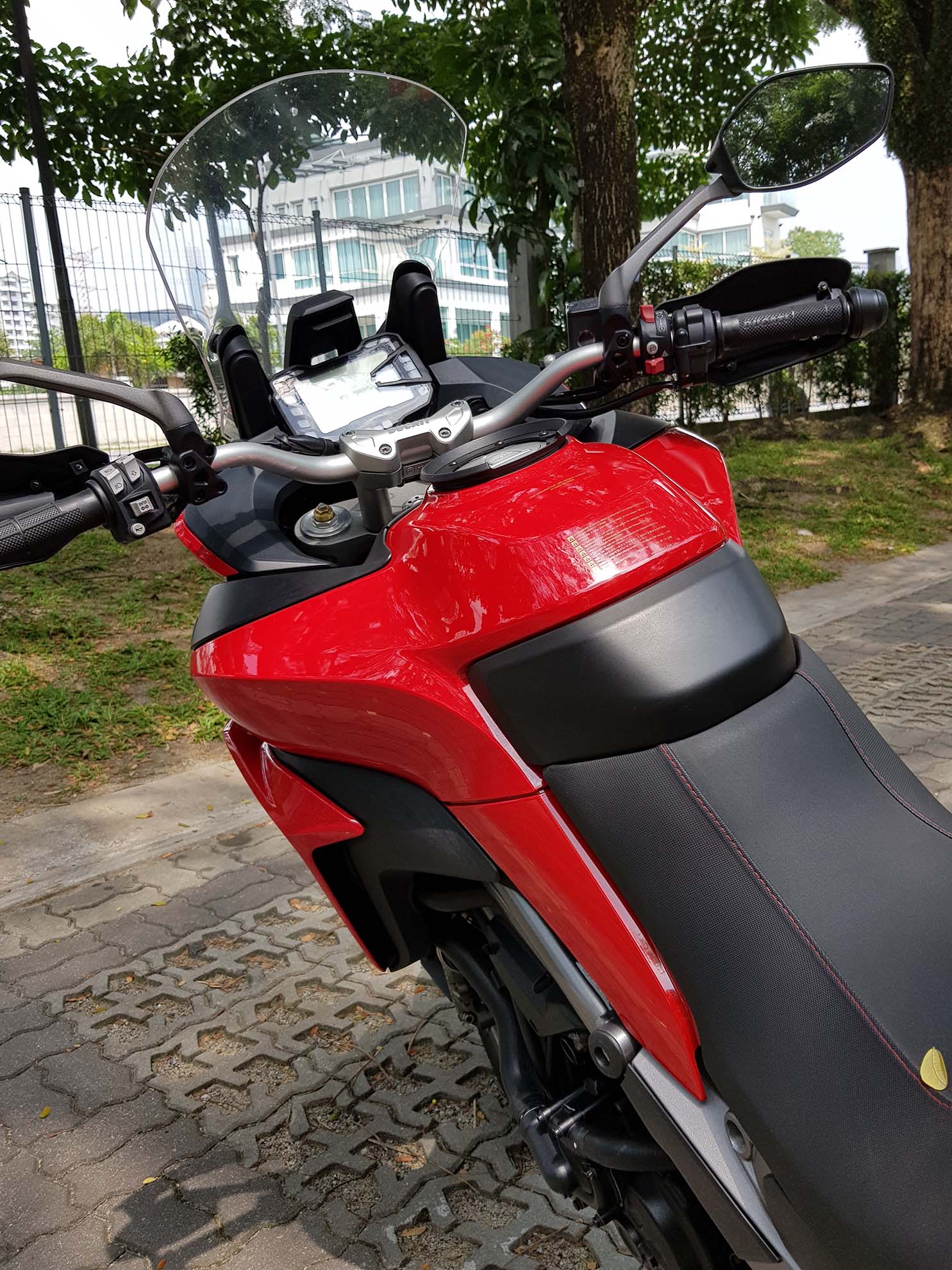 Jom, sekarang masa untuk kita bersiar-siar. Admin memang dah buat perancangan untuk ber”dating” dengan Ducati Multistrada 950 ni. Jalan jauh sikit rancangnya. “MY FIRST”. Selepas ambil dari “showroom”, admin sudah menempuh lalu lintas yang boleh dikatakan sesak. Mulanya panik juga kerana susuk tubuh admin yang kecil dan untuk mengawal sebuah motosikal yang agak tinggi mesti kena betul-betul “balance”. Tetapi kedudukan admin ketika menunggang Ducati Multistrada 950 ini membuatkan ia sangat mudah untuk dikawal. Amat mudah untuk menyesuaikan diri pada kali pertama menunggangnya. Sebagai contoh, bahagian tangkinya direka bagi membolehkan penunggang merapatkan kaki pada tangki itu secara semulajadi berbanding sesetengah jenama lain yang mempunyai tangki yang agak besar dan membuatkan kedudukan penunggang yang tidak “bersekali” dengan motosikal itu. Kedudukan hendal yang agak tinggi juga membantu memudahkan penunggang mengawalnya. Tak rasa seperti mengawal sebuah motor yang agak besar. Mencelah juga mudah, seperti sudah mahir menunggang Ducati Multistrada 950 ini.