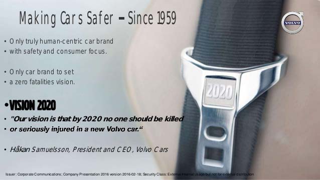 Volvo Cars secara aktifnya telah mengumpulkan data kemalangan jalanraya sejak 40 tahun lalu.Baru-baru ini Volvo Cars memgumumkan Project EVA ( Equal Vehicles for All), membolehkan mana-mana pengeluar kenderaan lain untuk bersama-sama mengunakan data kaji selidik yang telah dilakukan, untuk menghasilkan kenderaan yang lebih selamat di jalanraya.Ini selari dengan keyakinan Volvo Cars bahawa keselamatan adalah untuk semua.