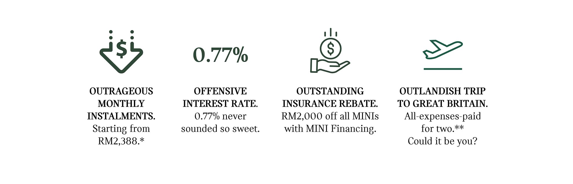 ‘The Great British Deal’ menawarkan ansuran bulanan yang jauh lebih rendah bermula daripada RM2,388 dengan MINI Balloon Financing, pada kadar faedah yang diturunkan bermula daripada 0.77% bagi kenderaan MINI yang dibeli mulai hari ini sehingga 31 Disember 2019. Pemilik-pemilik baharu juga dapat menikmati rebat insurans bernilai RM2,000 bagi pembelian jentera MINI menerusi pelan pembiayaan MINI tersebut.