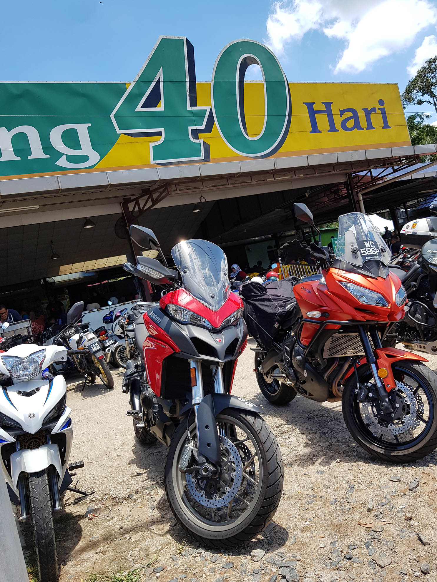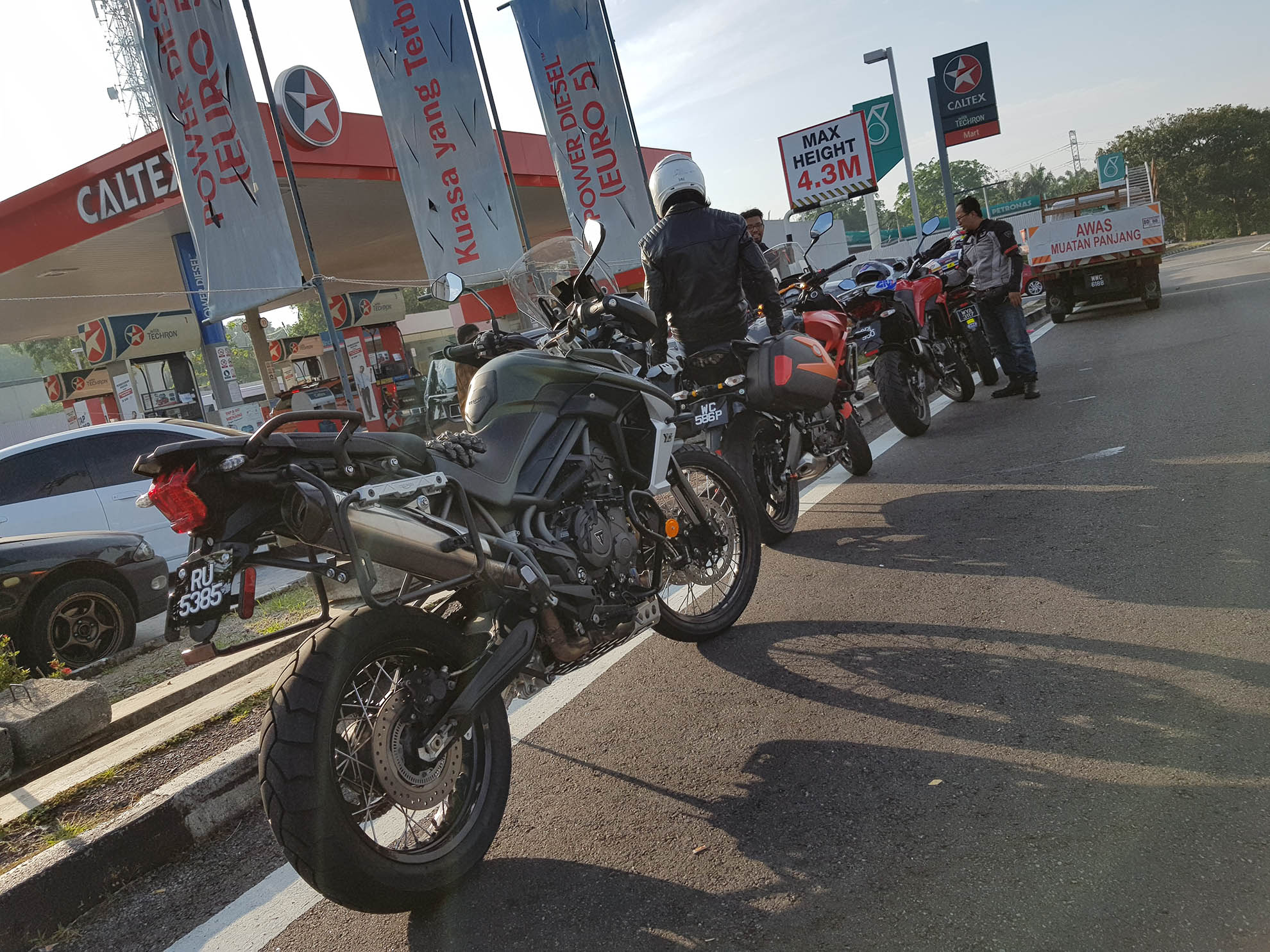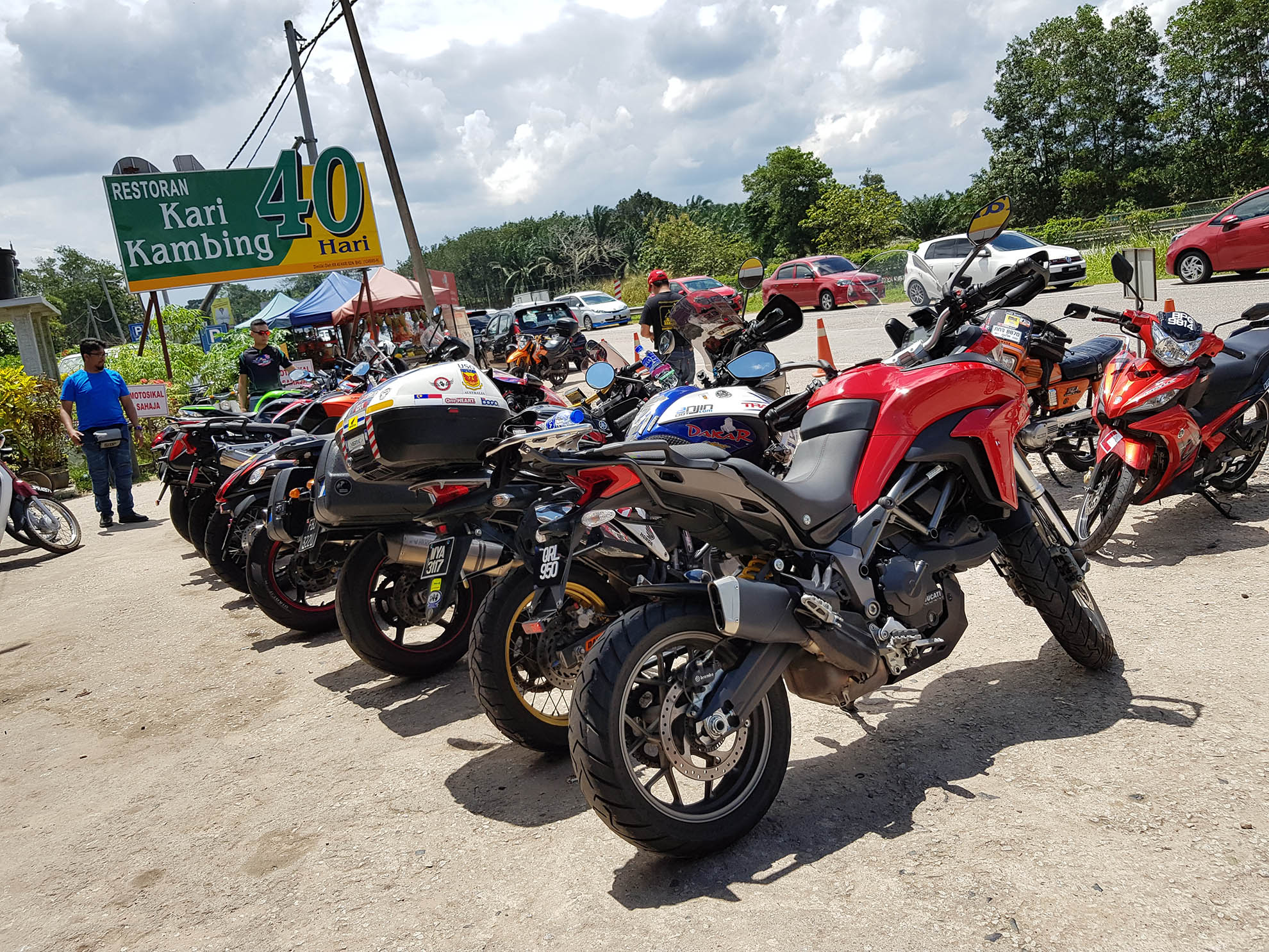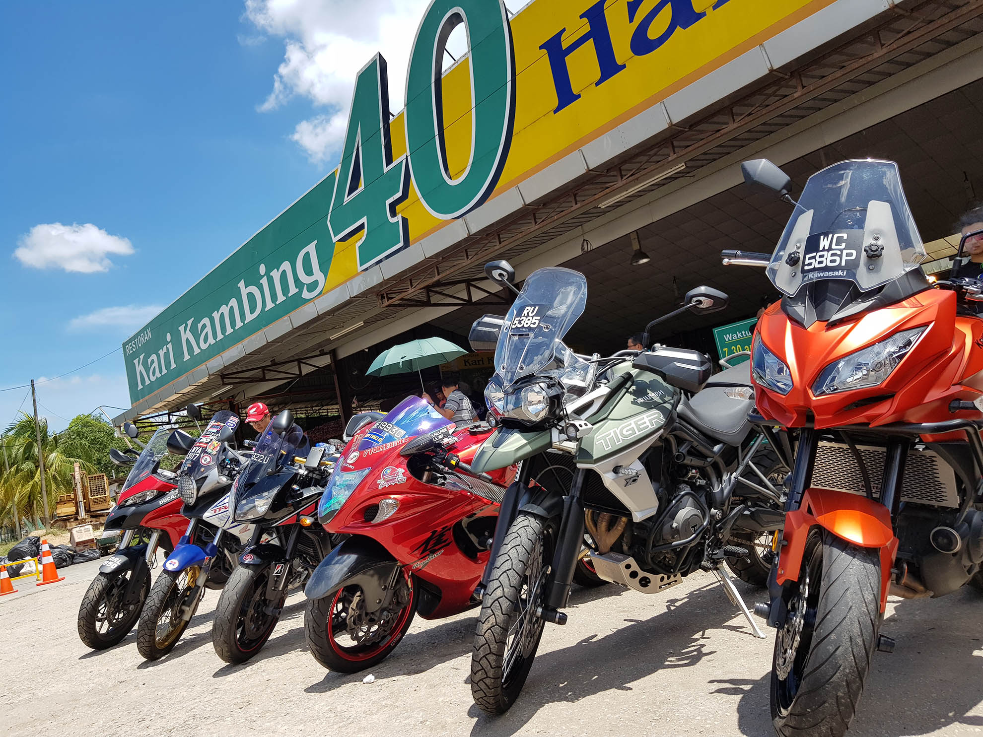 Kebetulan pada kali ini, admin berpeluang bersama beberapa orang rakan yang menunggang beberapa buah motosikal dari Malaysia, Ducati Multistrada 950, Triumph Tiger 800 XcX, Kawasaki Versys 650 dan Honda Transalp (atau lebih dikenali di kalangan orang lama sebagai Motor Unta). Perjalanan bermula setelah semua berkumpul di Shell R&R Seremban arah selatan. Sebelum bergerak, sedikit taklimat mengenai keselamatan dan perjalanan disampaikan walaupun kumpulan ini terdiri daripada penunggang yang berpengalaman. Sebagai manusia kita kena sering beringat dan berkongsi aspek keselamatan di jalan raya khasnya mengenai cara tunggangan. Konvoi bergerak menuju ke Plaza Tol Ayer Hitam untuk bergabung dengan kumpulan dari negara jiran kita, Singapura yang datang dengan Suzuki Hayabusa, Honda CBR 1000RR, Kawasaki ZX10R,Yamaha Fazer dan Yamaha T-Max 500. Disini, kami mengambil kesempatan berkenalan sedikit sebelum meneruskan perjalanan ke Restoran Kari Kambing 40 Hari di Yong Peng.
