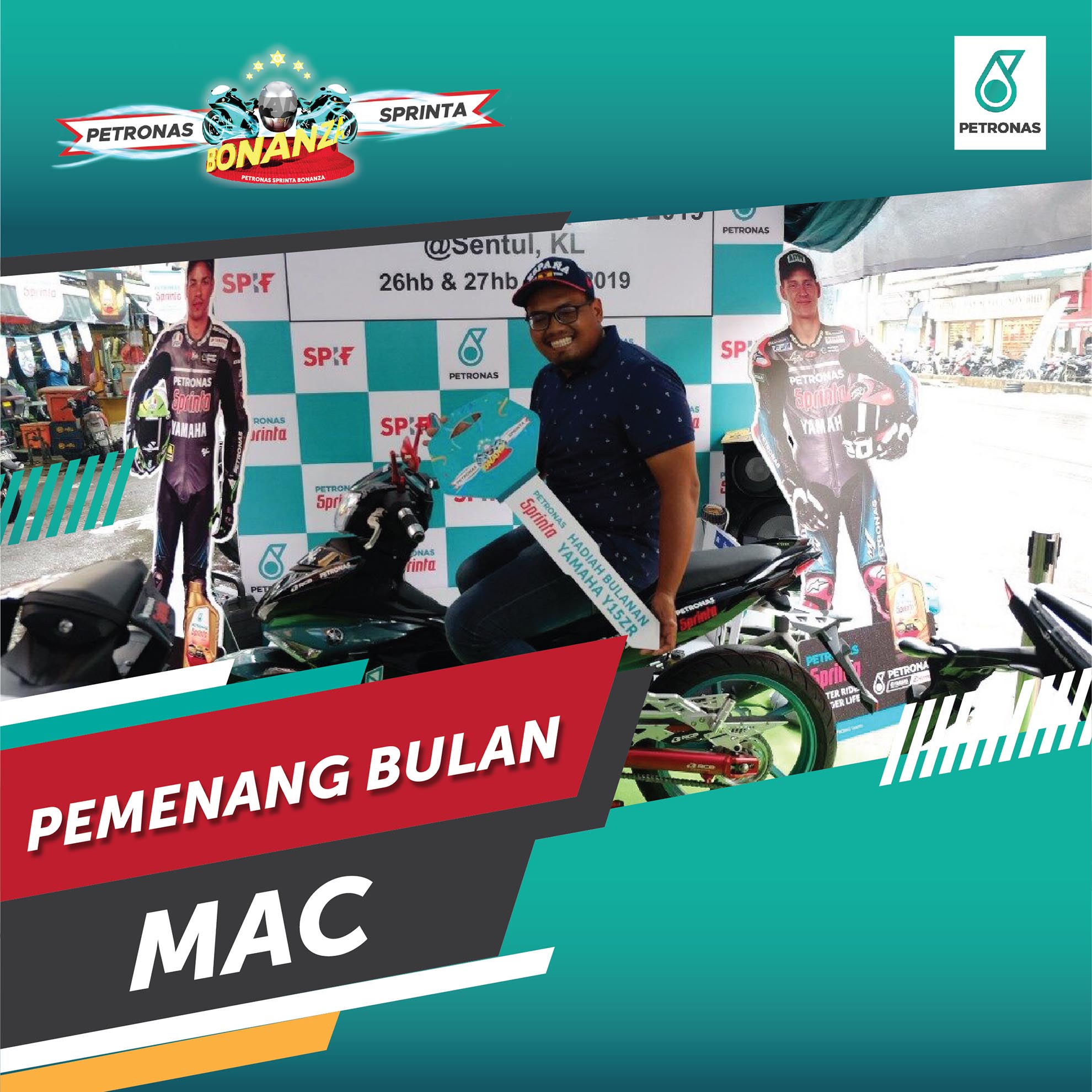 Hadiah bulanan yang berupa sebuah motosikal YAMAHA Y15ZR disampaikan oleh Ketua Peruncitan PLMM, Encik Mohd Bahrin Mohd Yunus di PETRONAS Tanah Liat yang merupakan stesen dimana belian Sprinta berkenaan dibuat oleh Ahmad Shafiq.