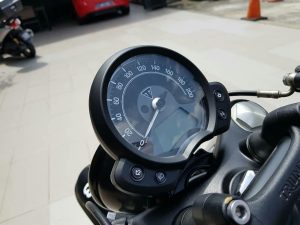Antara maklumat yang ditunjukkan di paparan digital kecil di bawah meter kelajuan analognya ialah kawalan cengkaman (traction control) dengan dua mod menunggang iaitu ‘Road’ dan ‘Rain’. Kebetulan waktu petang di sini, cuaca tak menentu dan semasa di Lebuhraya Karak admin menggunakan mod ‘Rain’ bila jalan basah kerana hujan, tindak balas pendikit menjadi lembut dalam mod ini bagi memudahkan kawalan penghantaran kuasa ke tayar belakang sebelum beralih ke mod ‘Road’ bila hujan berhenti dan jalan menjadi kering. Triumph Bonneville Bobber bertindak cemerlang dan admin hanya ternampak gelengan kepala pemandu lain melihat Bobber ini meluncur lancar seolah-olah tiada halangan di hadapannya, bersahaja.