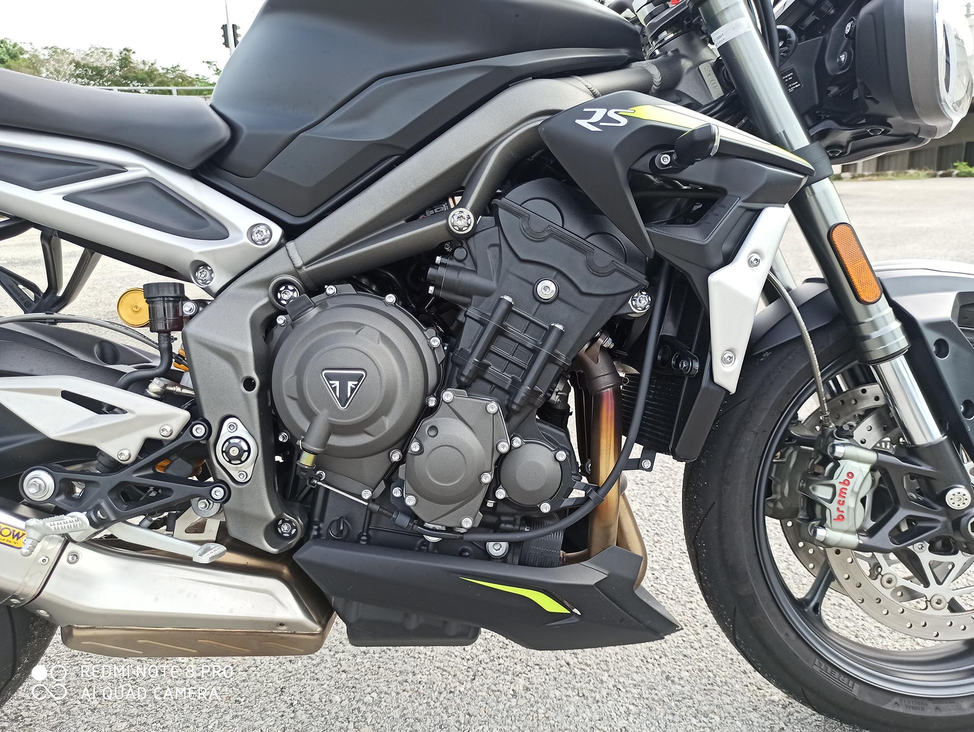 Triumph Street Triple RS menggunakan enjin tiga silinder yang menjana kuasa sebanyak 121 hp pada 11,750 rpm dan tork 79 Nm pada 9,350 rpm – kuasa yang anda boleh gunakan pada bila-bila masa. Walaupun sesaran enjin ditingkatkan kepada 765 cc pada tahun 2017, rekaan casis dan suspensinya masih kekal seperti model sebelumnya. Di bahagian depan adalah sepasang Showa Big Piston Forks 41 mm yang boleh dilaras sepenuhnya, digabungkan dengan suspensi piggyback Öhlins STX40 dengan spesifikasi terbaik di bahagian belakang yang juga boleh dilaraskan. Brek hadapan ialah daripada Brembo M50 4 piston dengan ABS dan brek belakang juga daripada Brembo dengan ABS.
